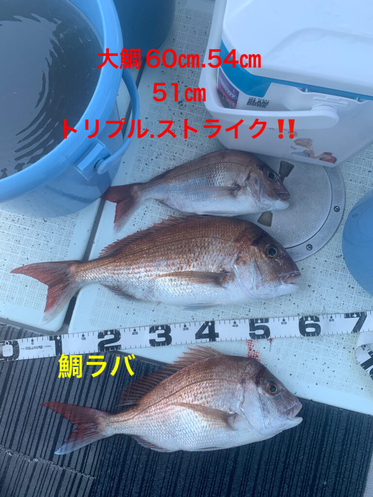 1日早い本日の潮アジロでしたが、合計30枚中、大鯛60㎝を2枚、良型真鯛50が10枚、30は4枚迄と型揃いの嬉しい鯛ラバ釣行と成りました🤩😆🎉👏