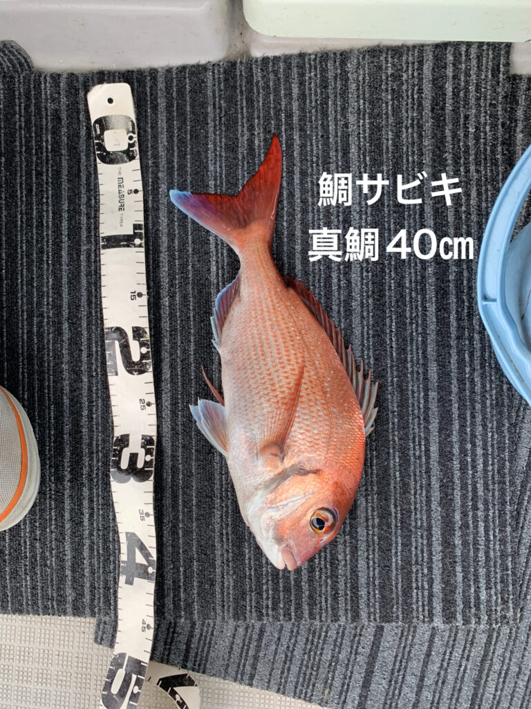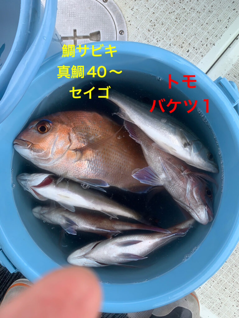小範囲パラパラ映りでしたが、サビキ仕掛けを投入してもらい早めに真鯛当たりが有り、真鯛30が釣れだしたが、時合いらしきは短め。