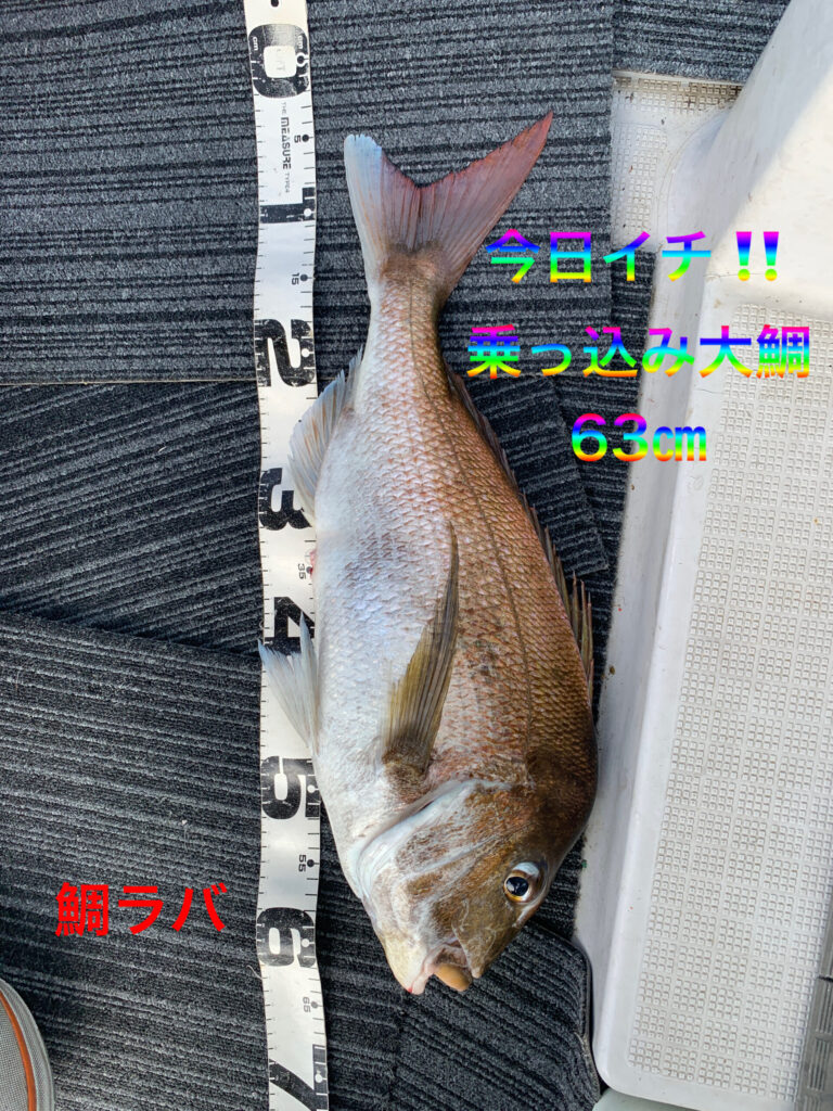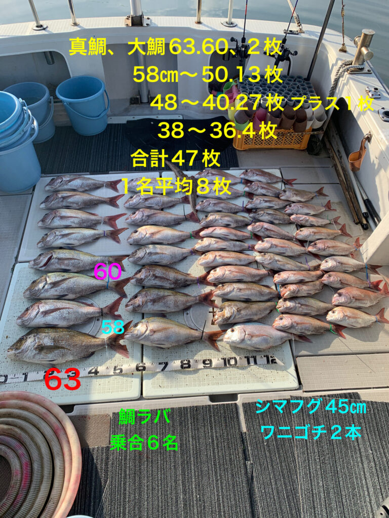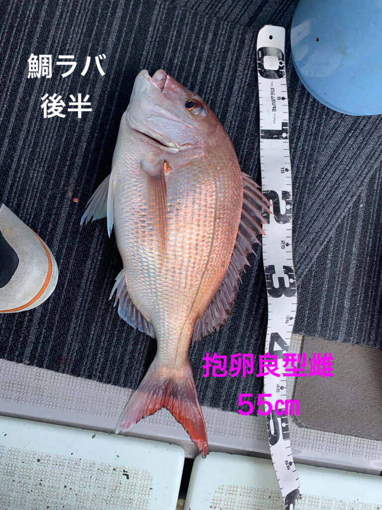 本日は大鯛63㎝.60㎝が2枚でしたが、抱卵良型雌を中心に40が27枚、50が13枚、30はわずか5枚の型揃い。
