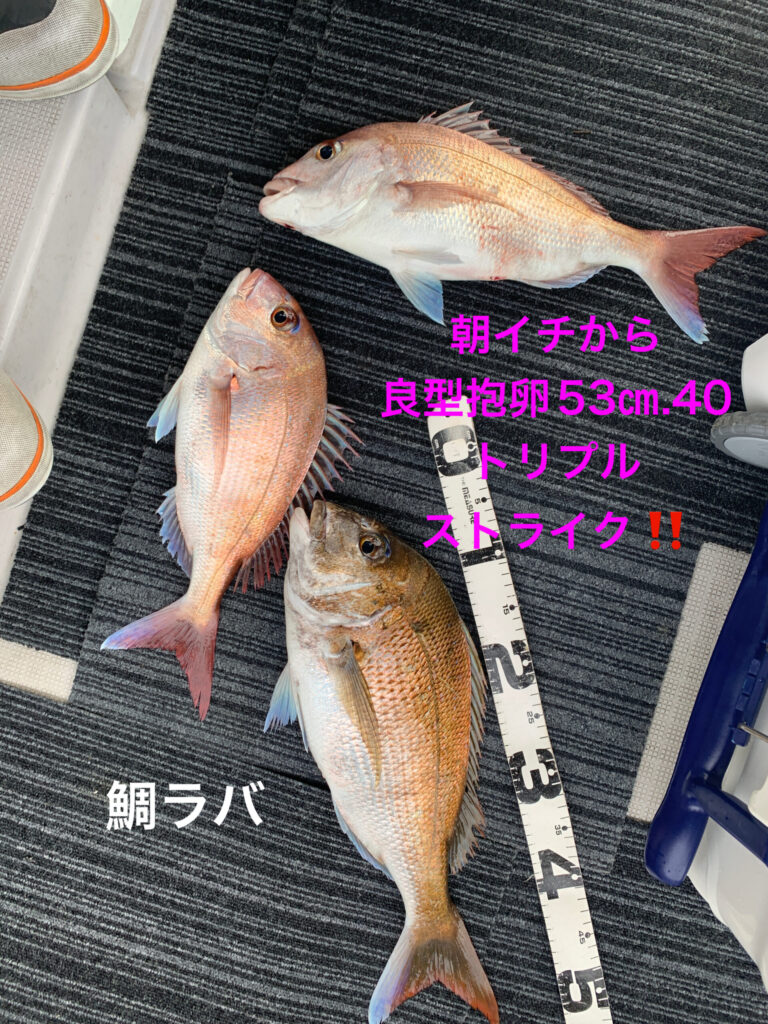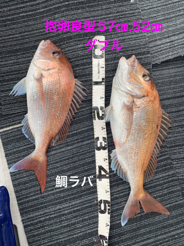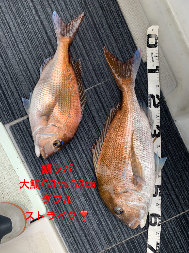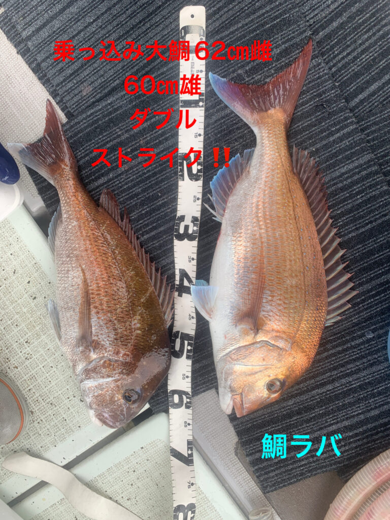 本日は初鯛ラバ挑戦の2名様が朝イチから今日イチ大鯛63㎝雄良型抱卵桜鯛53㎝雌をダブルストライク‼️