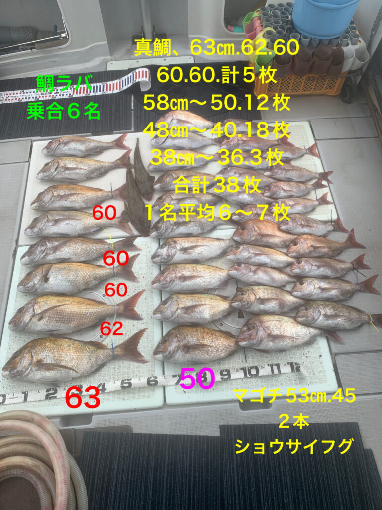 真鯛、大鯛63㎝.62.60.60.60、計5枚